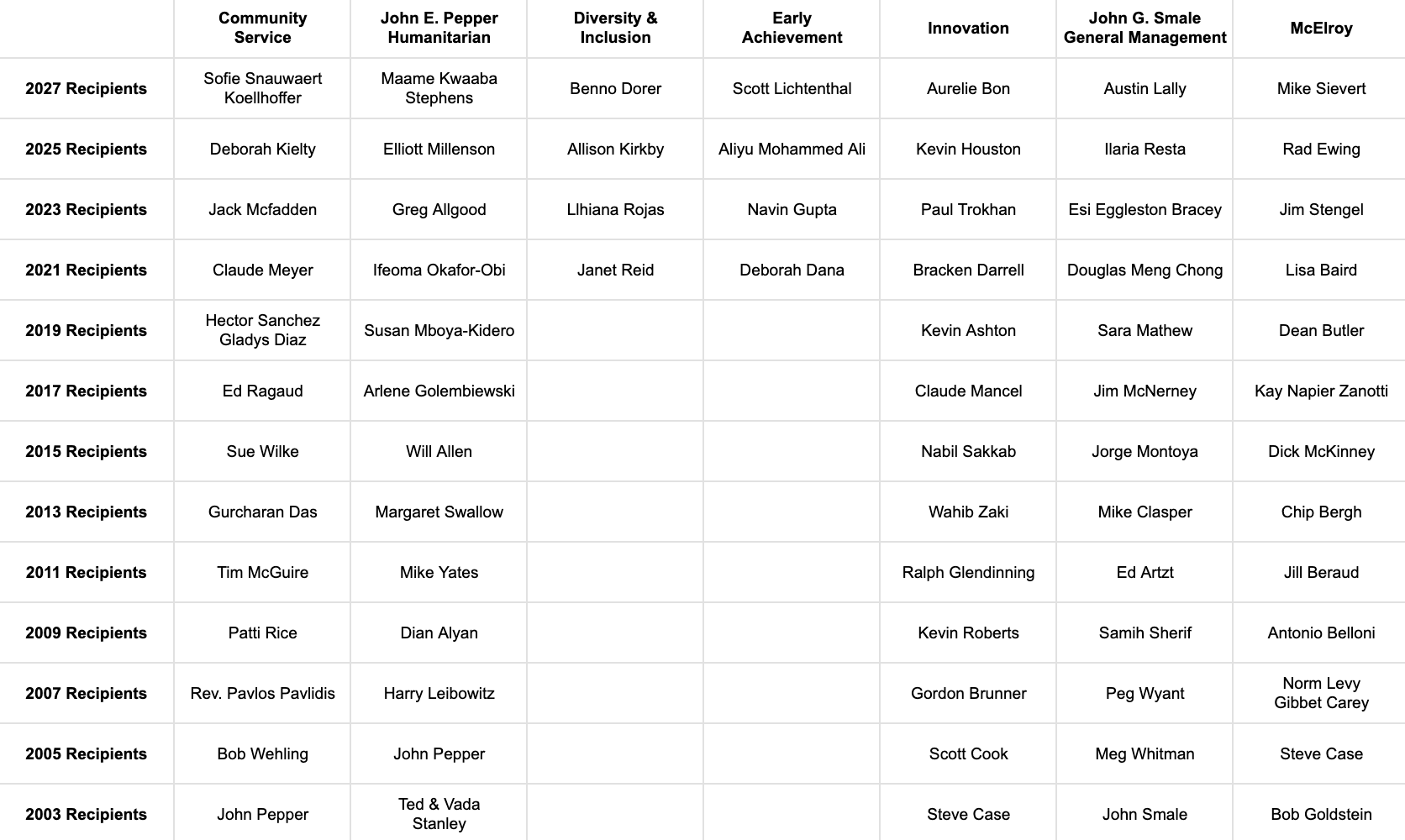 Since our inception, the P&G Alumni Network has recognized P&G Alumni leaders who have continued to impact their industries and communities, during and beyond their service at P&G.