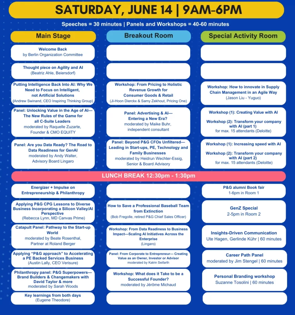 Don’t miss this opportunity to engage with our P&G Alumni Network of like-minded professionals, gain valuable insights, and future-proof your leadership skills in the vibrant city of Berlin. Please choose your relevant tickets here.