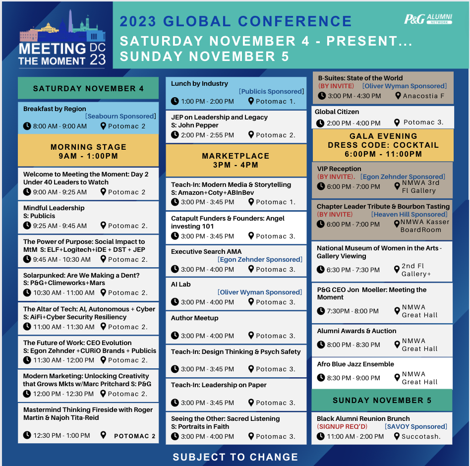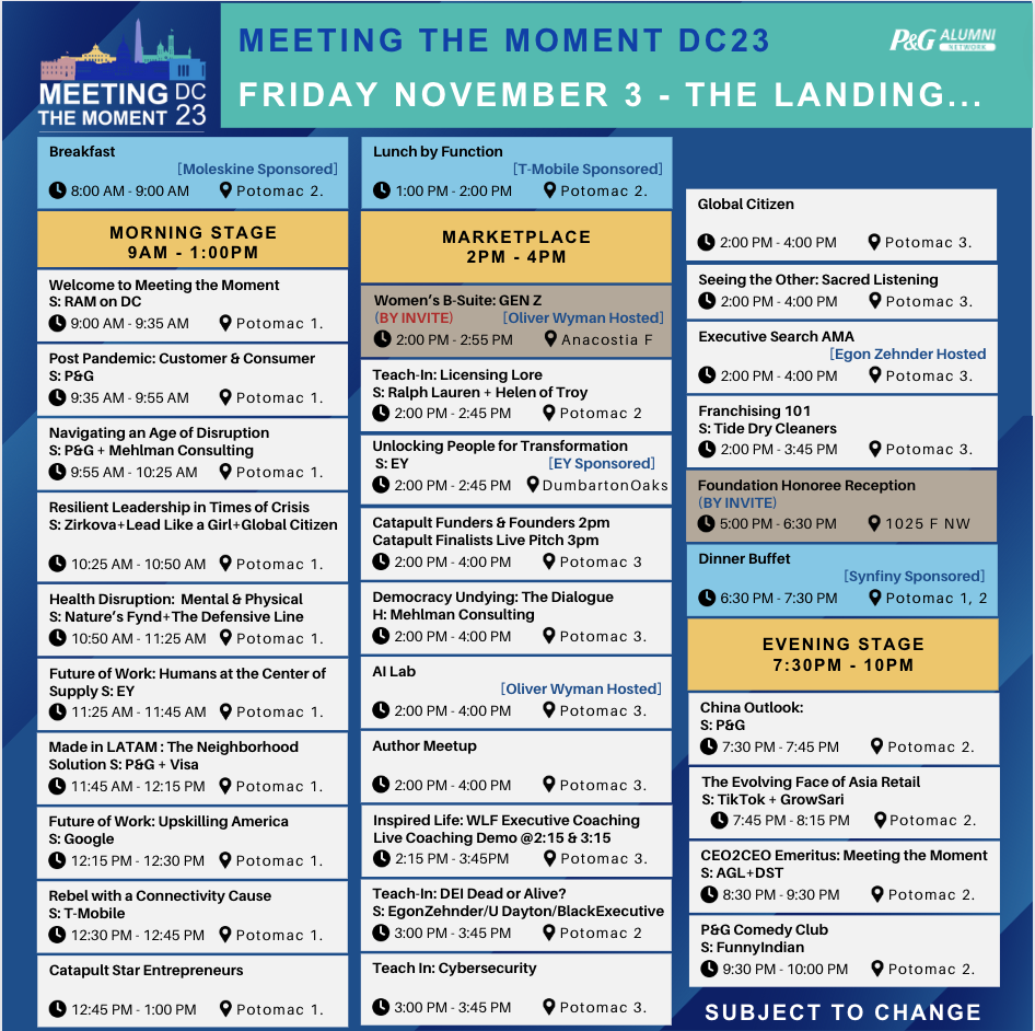 Guided by industry experts and emerging influencers, including five P&G CEOs, we will engage in dialogue on trends, health, climate, equity, tech, the future of work, civics, and philanthropy—as an invitation to take personal responsibility in the social & professional circles we keep while “meeting this moment as a force for growth and a force for good” in the world.