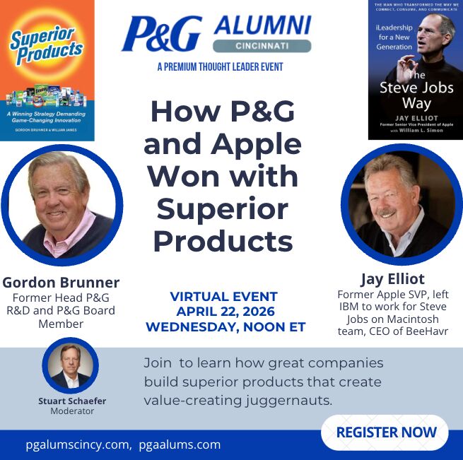 Join the P&G Alumni Cincinnati Chapter for a webinar entitled: How P&G and Apple Won with Superior Products.