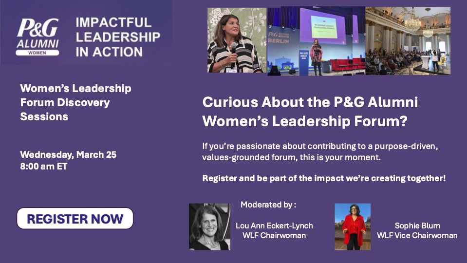 The session includes open dialogue, Q&A, and space to exchange ideas with fellow alumni who are passionate about shaping the future of women’s leadership within the P&G Alumni Network.